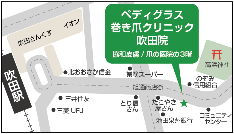 住 所:大阪府吹田市内本町2丁目1-9 協和皮膚/爪の医院 3階